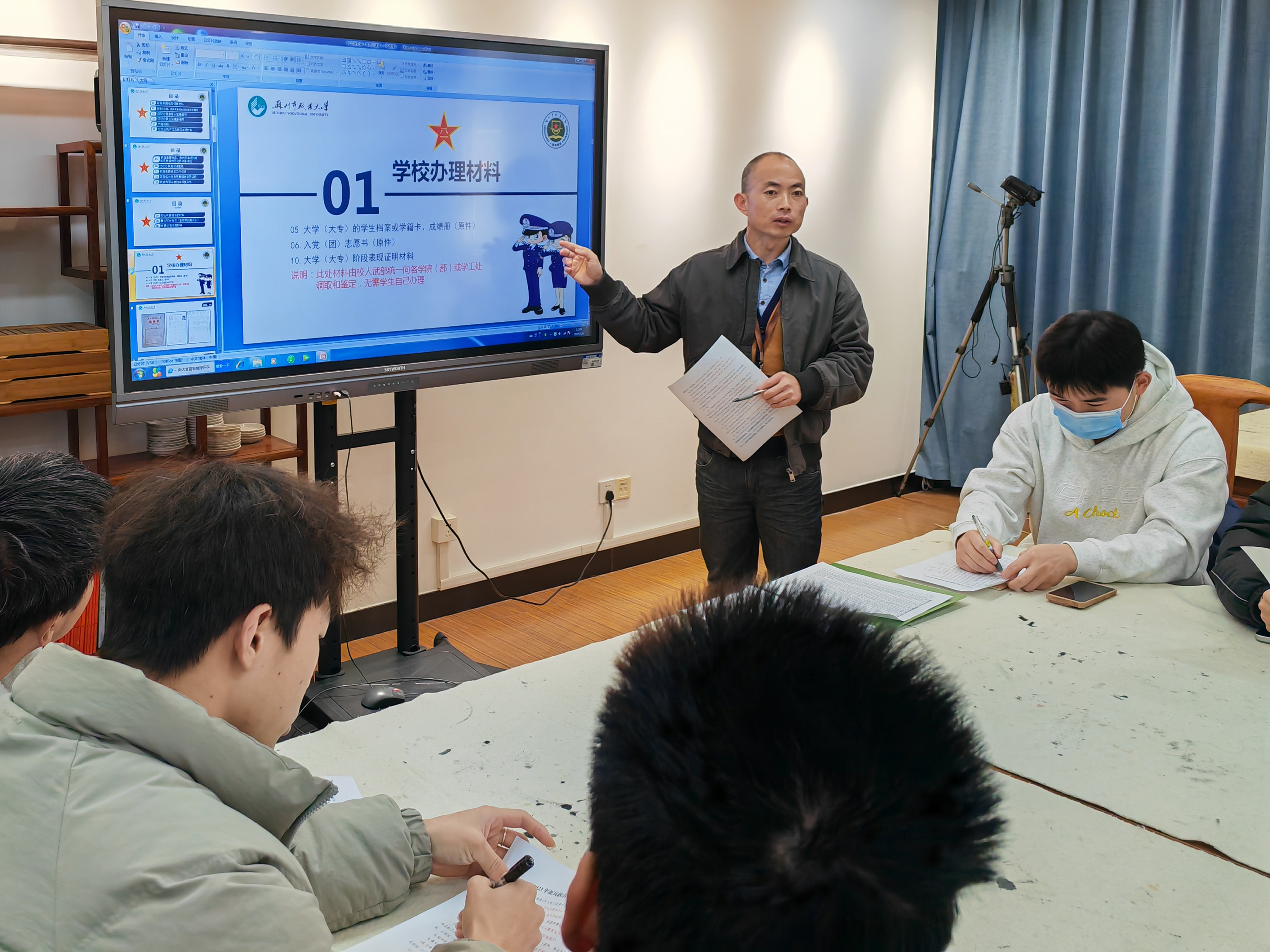 政审材料复杂易错,他主动前往区政考组“取经”,将23份材料制成详尽模板,标注填写方法、注意事项,辅以合格样图,确保学生一目了然。担心理解不透,他又精心制作PPT进行培训指导,最终被吴中区征兵办在全区推广。疫情期间,学生分散,政审材料办理受阻。他用腾讯会议开展远程培训指导,反复叮嘱:“材料先拍照给我看,确认无误再签字盖章。”一年两次征兵,两次培训必不可少,无论线上还是线下,他都倾心教授,只为让学生少跑路,少花邮寄费。