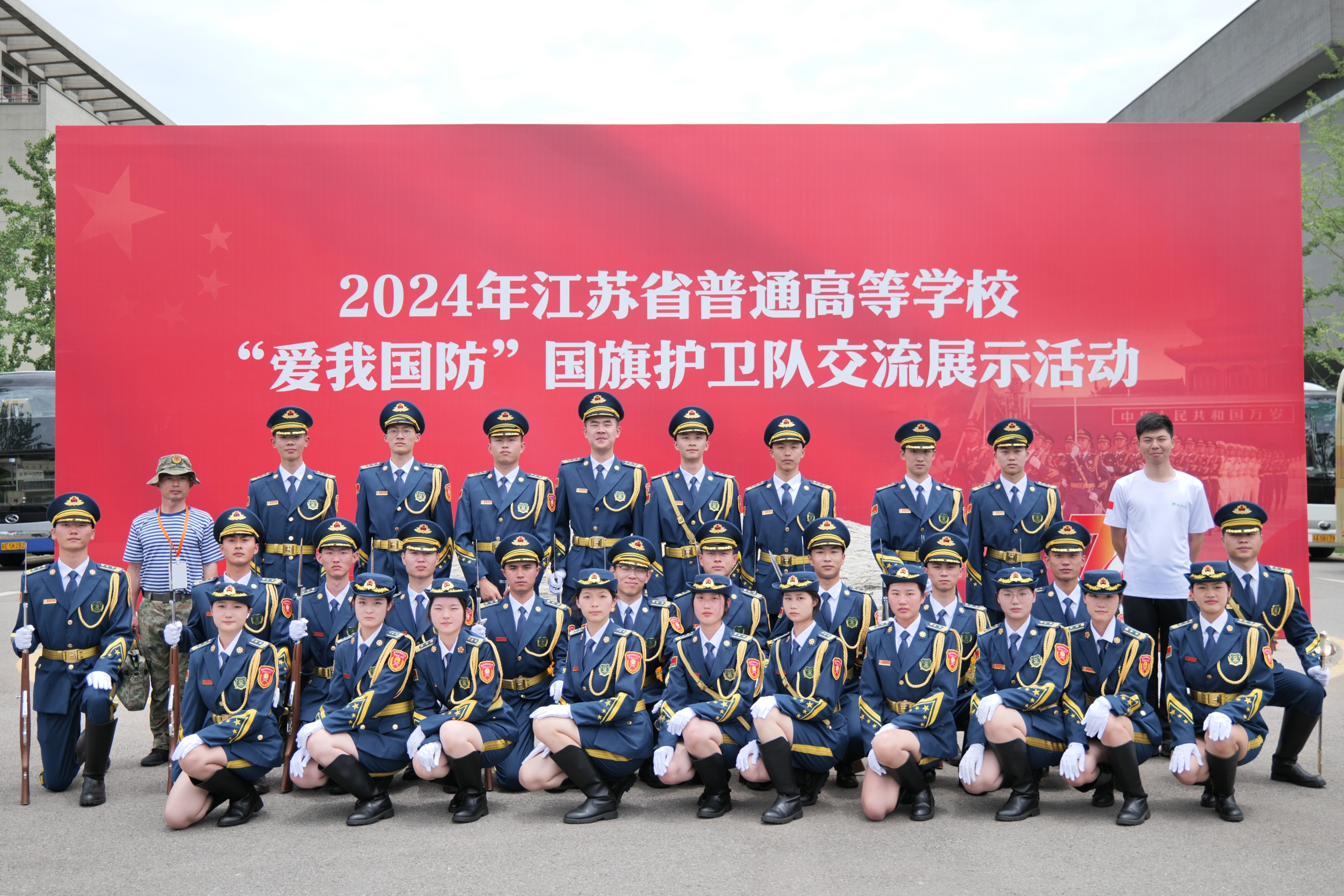 其中,国旗护卫队不仅圆满完成校内每周升旗仪式及各类大型活动的护旗任务,更主动走出校园,协助驻地机关单位开展国旗文化交流活动,成为传递红色信仰的流动旗帜。在2024年全省高校国旗护卫队交流展示中,该队作为苏州市唯一晋级的参赛队伍,凭借过硬的素质与饱满的精神斩获“银牌国旗护卫队”荣誉称号,队中4名同学也因突出表现荣获优秀个人表彰,为学校赢得了荣光。